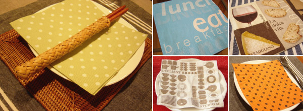 来客時のテーブルでいつも使うのが、ペーパーナプキン。布のナプキンほどの「きちんと感」はありませんが、仲間うちでワイワイ楽しむカジュアルなホームパーティには気兼ねなく使える紙製のナプキンの方がお客様もラクなのかも知れません。最近はかわいい色柄のものがたくさん出ているので、ランチョンマットやテーブルクロスとの組み合わせ次第でテーブルが華やかになります♪普段から気に入った色柄のものを見つけたら買うようにしています。