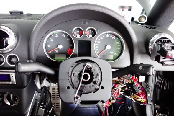 ステアリングの外す際に、注意する点として、アングルセンサーを回さないように、固定しておく必要があります。