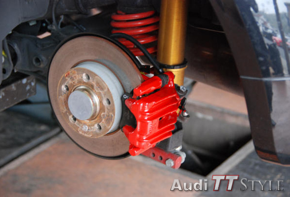 内装も赤だし、Fブレーキも赤になったことだし、ついでにリアブレーキも、赤へ塗装して頂きました。